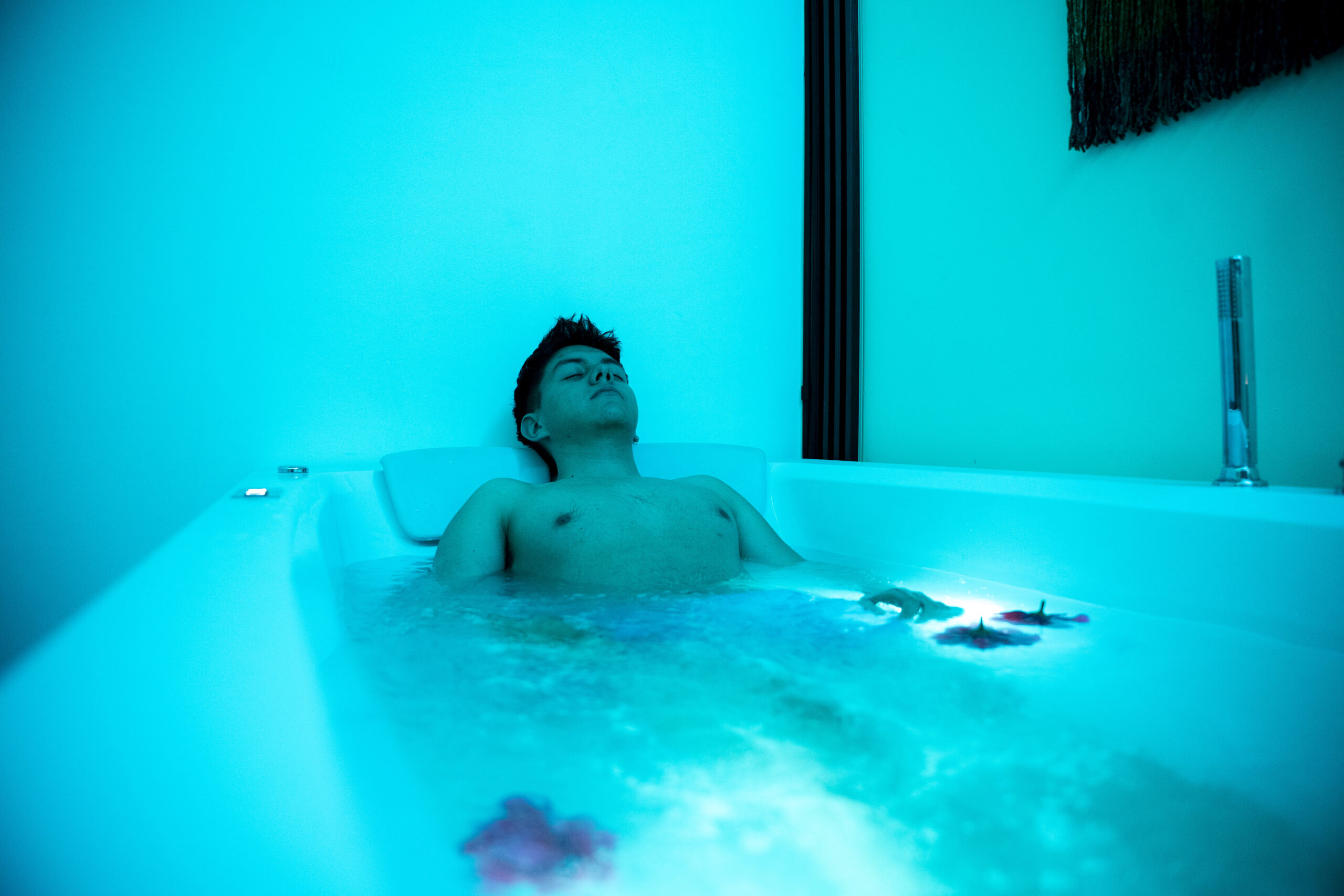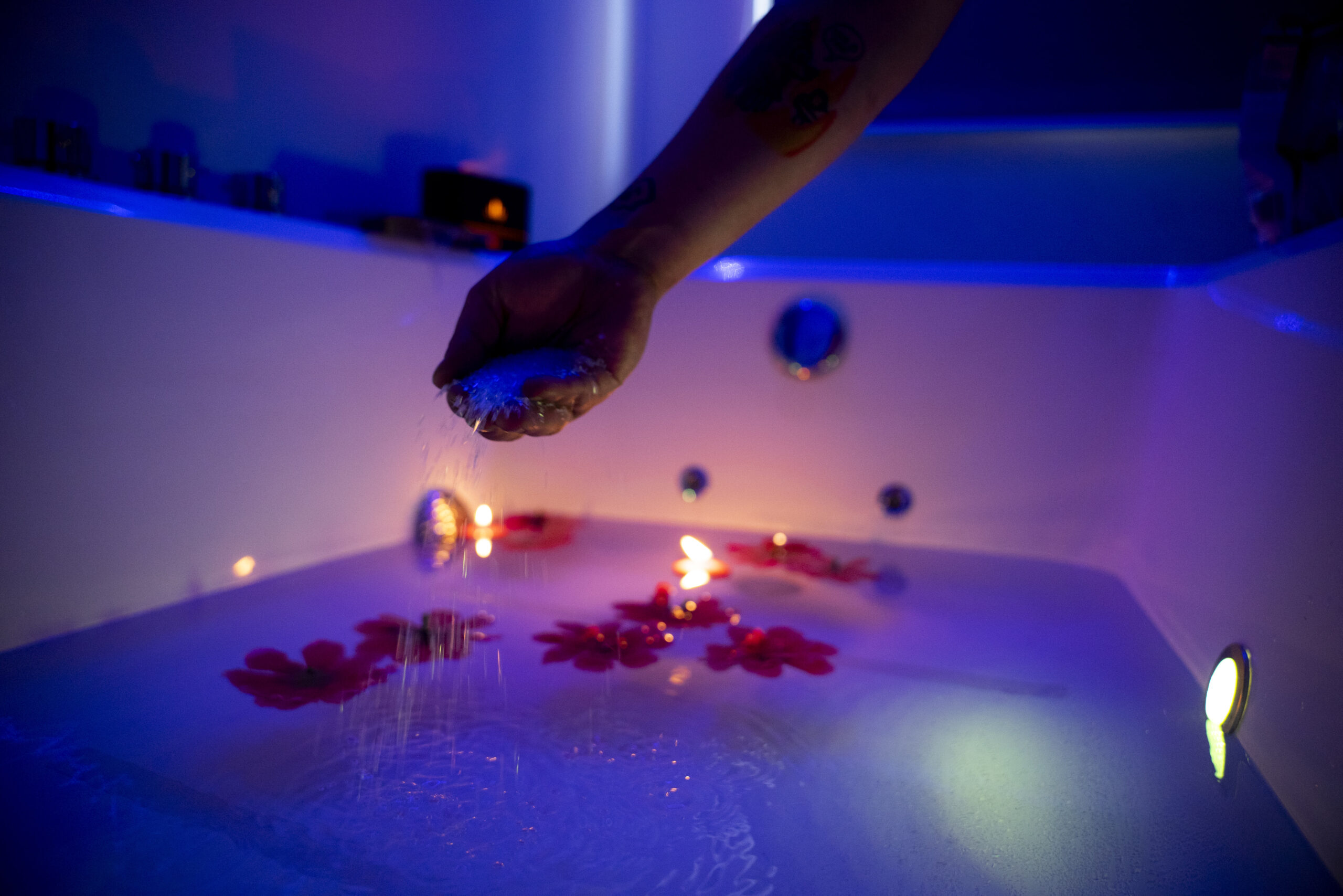 Tina de hidromasaje con cromoterapia y sales aromáticas.